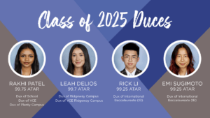 Congratulations to the Class of 2025 VCE and International Baccalaureate Diploma Program (IB) graduates. The Class of 2025 has demonstrated exceptional dedication and unwavering commitment and delivered another impressive set of academic results. Although we acknowledge all our students for achieving their best, we also recognise our Duces with exceptional ATARs. Once again, congratulations to our Dux of VCE at each campus for each receiving exceptional results alongside Rick Li and Emi Sugimoto as our IB Duces. Well done Rakhi Patel from Plenty Campus, who achieved an ATAR of 99.75 and Leah Delios from Ivanhoe Campus, who achieved an ATAR of 99.7.